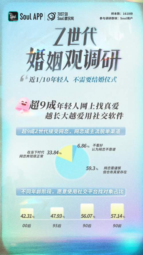 同时,Soul旗下社会科学研究机构Just So Soul研究院,以站内大量Z世代用户为调研对象,发布了一份《Z世代婚姻观调研》,探究当下年轻人对待爱情与婚姻的态度。调研显示,社交软件成主流脱单渠道,超9成Z世代接受网恋;超7成年轻人表示可以接受异地恋;超8成年轻人期待婚姻,半数以上受访者表示不在意彩礼。