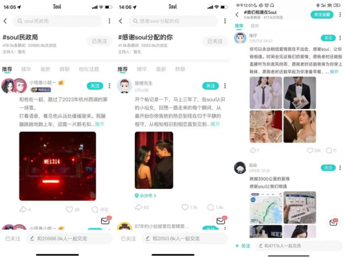在Soul上因兴趣而走到一起的故事还有很多,短片中三对恋人的甜蜜爱情故事,只是一个缩影。根据Soul站内数据,在#Soul民政局、#我们相遇在Soul等站内话题下,Soul用户分享关于相遇相爱的瞬间超65万条。据不完全统计,约有9.5万人在这里找到真爱。