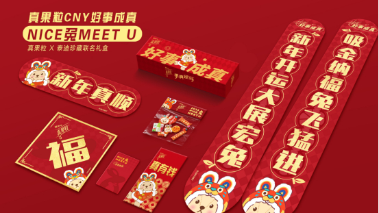 以联名新年礼盒为例,诚然,对联、福字这类新春贺礼并不罕见,但此次推出的新春礼盒充分发挥了泰迪珍藏这一IP的颜值优势,让消费者一眼万年,必将在众多同质化产品中脱颖而出。将联名春联张贴后,不仅展示了真果粒对消费者美好的祝愿,更是真果粒品牌与消费者一整年的相伴,对于营销活动来说,这绝对是事半功倍的操作。