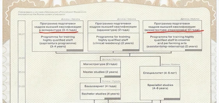 在《俄罗斯联邦教育法》No 273- Ф3 第二章教育制度, 第 10 条教育系统的结构中,高等教育- 高素质人才的培训计划(一般理论博士研究生与表演博士)属同等级别,也间接表明了所获证书与俄罗斯普通公立大学颁发的博士学位证书同属一个资历等级 。(见图五)