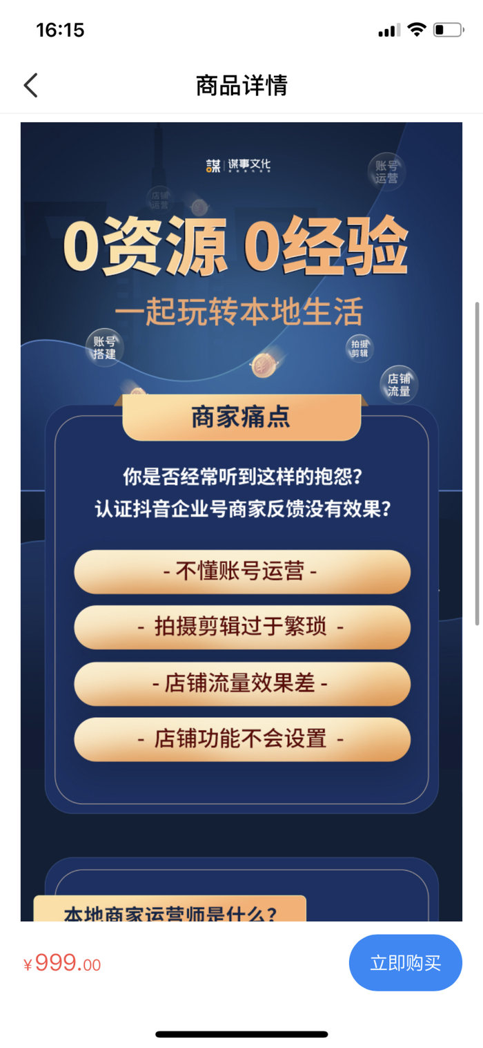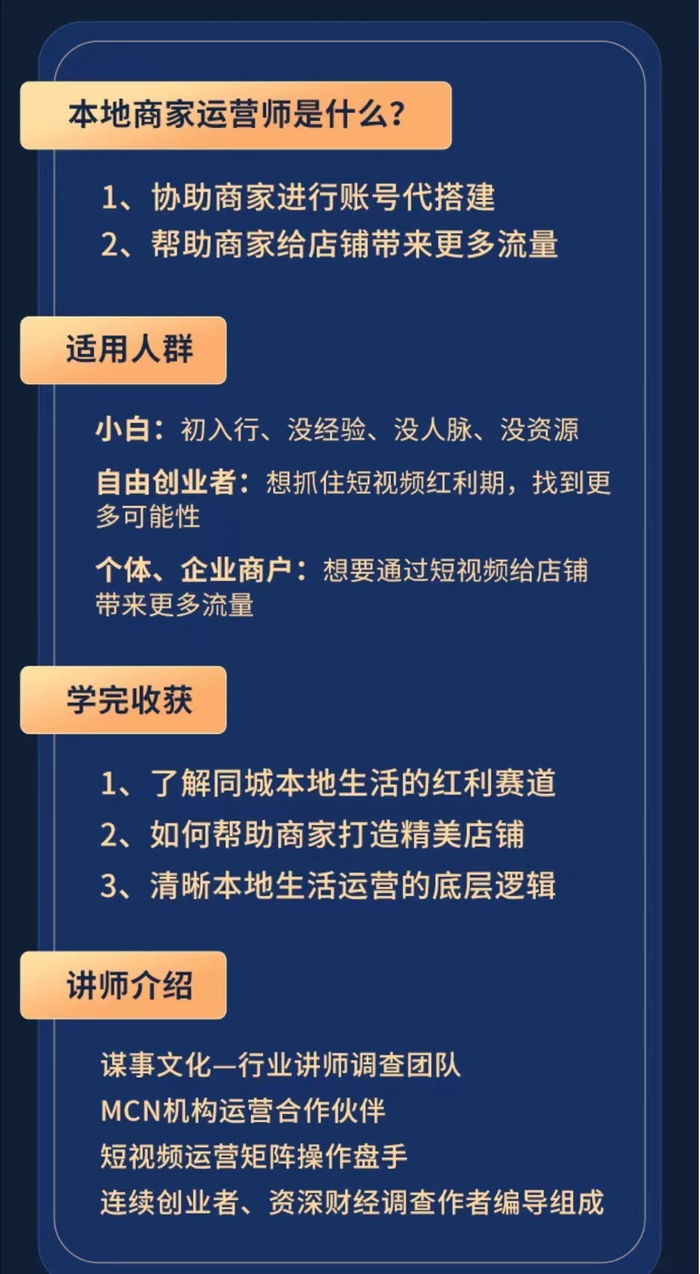 庞大的市场需求,需要大量的人来做,强大的下沉市场下,谋事文化“本地商家运营师”课程应运而生,也成为了许多小微商家最佳的选择。怎么引流、怎么优化商品、怎么做促销、怎么对接达人带货等等,这些让商家头疼的问题,本地商家运营师都能一站式解决。