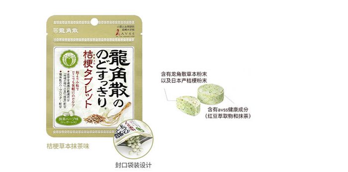 蜂蜜柠檬味中特别添加清凉微粒,可以给咽喉带来清凉快感;荔枝薄荷味开袋即可享受浓郁的荔枝香气,深受“水果党”喜爱;草本抹茶味中加入了桔梗粉末以及龙角散携手长崎大学共同研制的AVSS健康成分,是换季等流感多发时节的热销产品。
