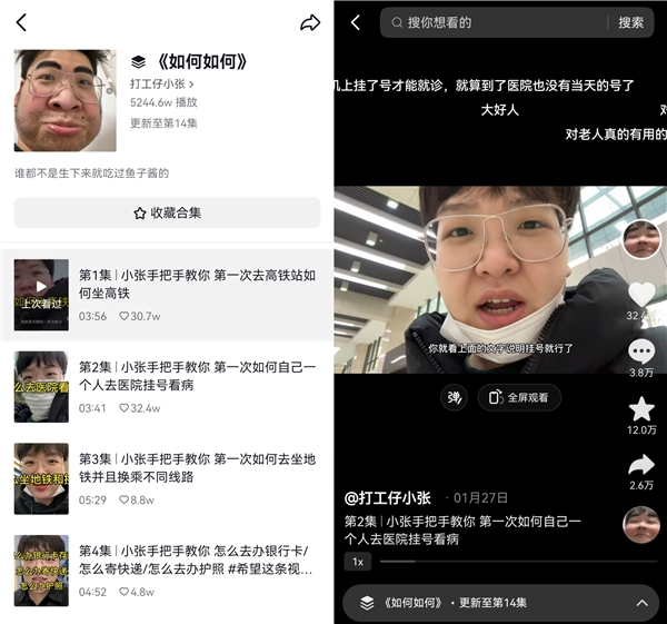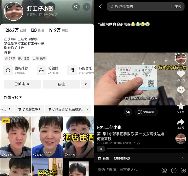 @打工仔小张 今年28岁,是一名视频创作者。过去一年多,她在抖音持续发布生活经验科普视频,比如如何坐高铁、如何坐公交、如何办理酒店入驻等。这些可能被人认为“这还要教?”的常识,却击中了被忽略掉的那部分人,深受不少网友喜爱。截至目前,她在抖音累计发布了400多条作品,吸引粉丝超过140万。近日,她还登上了社交网络热搜。