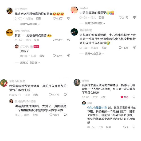 小张的视频大多数是日常生活流水账,但实用且接地气。在她的视频中,几乎每条视频的评论区都好评如潮:“感觉这种科普真的很有意义”“没出过县城的高中生需要博主的关怀”“我觉得听她说话很舒服,真的是以好朋友的语气在教我们”。除了有用,她的视频还温暖了更多人。其中,就有人评价说“明明觉得自己烂透了,但是还会有人在做引路人。”也有网友表示,其实这才是网络、短视频作用的体现,能够无门槛帮每一个人缩小信息差,至少第一次去城市不用那么迷茫。