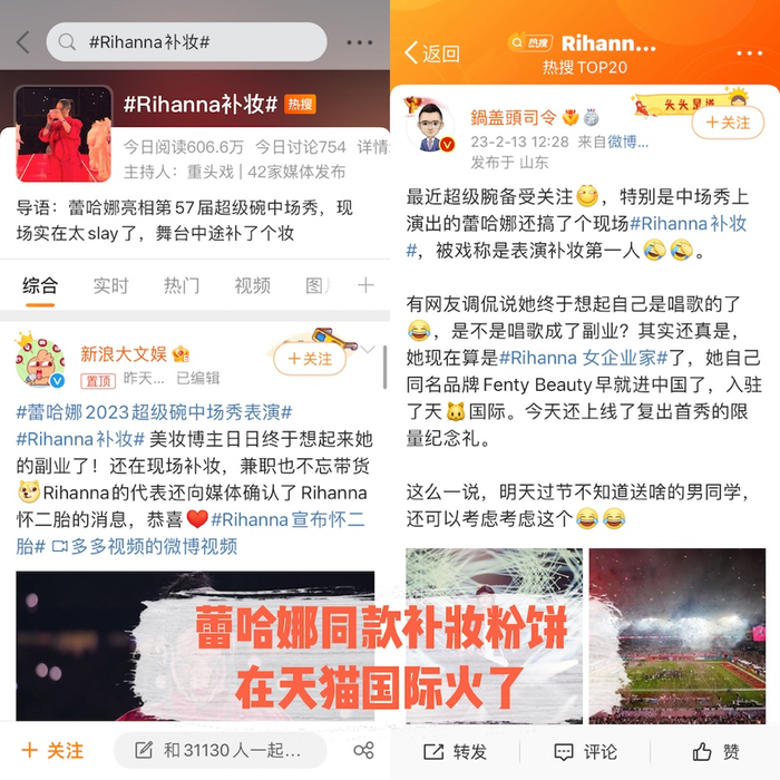 在刚刚结束的“美国春晚”超级碗中场秀表演中,美国歌手蕾哈娜唱到一半直接现场补妆,用的正是个人品牌粉饼Fenty Beauty。网友纷纷评论:“女企业家果然唱歌才是副业,带货才是王道!”