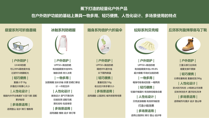 对于新中产和年轻人来说,除了基础防护功能,他们更注重户外产品是否人性化、是否出门方便携带、是否能避免置家落灰……与此同时,越来越多的人更讲究户外生活的整体“轻松”感。蕉下前瞻性地洞察到了户外行业正在发生的需求变化,并于业内首个提出这种新趋势就叫轻量化户外。