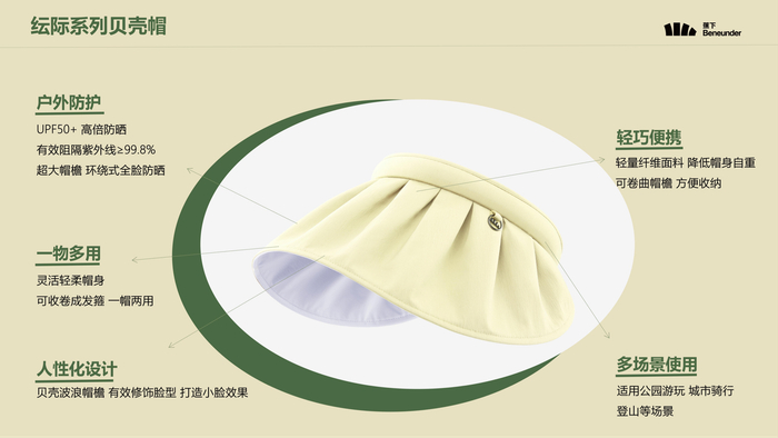 例如上文中提到的蕉下贝壳防晒帽,除了具有时尚性的贝壳状大帽檐设计,能够实现环绕式全脸防晒,同时帽檐快速收卷还可以变身发箍,使其成为一件既防晒又时尚的户外出行热门单品;此外,帽檐处加厚的止汗防滑带设计,使得佩戴时不易滑落,即使是快走、慢跑、徒步等多种中等强度户外运动场景也可轻松适用。一件贝壳帽便兼具了全脸防晒、一物多用、人性化设计、多场景覆盖的多重特点。