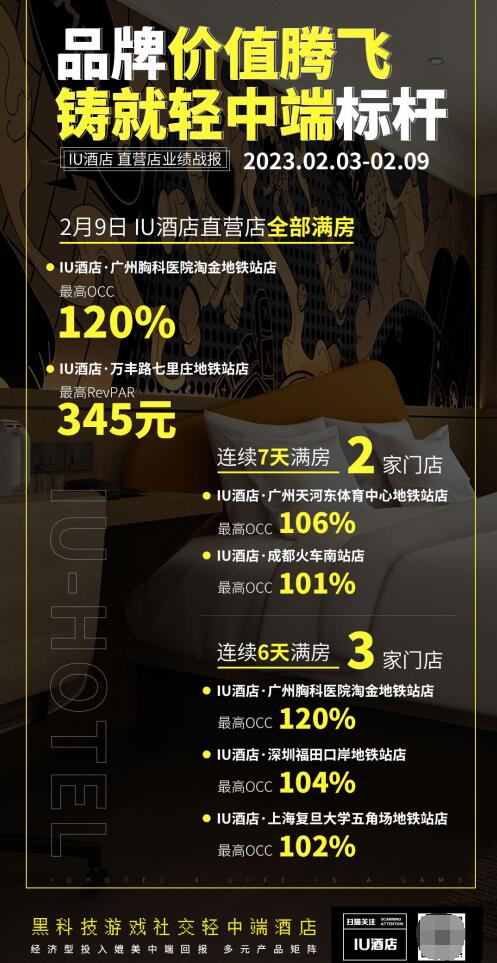 IU酒店作为轻中端酒店开创者,凭借自身极致投资性价比的品牌优势,实现业绩大幅回暖,无论是加盟大盘还是直营层面,IU酒店业绩处处表现强势。2023年2月9日IU酒店直营店全部满房,其中最高OCC120%——IU酒店·广州胸科淘金地铁站店,最高RevPAR345元——IU酒店·万丰七里庄地铁站店;另共2家IU直营店连续7天满房,3家IU直营店连续6天满房。