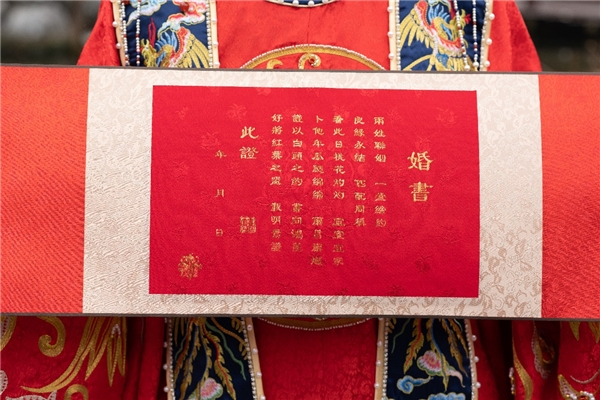 为了推广中式婚俗之美与云锦技艺,南京云锦研究所创新改良流传1600年的云锦织造技艺,推出《「奉旨成婚」云锦织金婚书》。在云锦婚书的正文中,以云锦工艺将新人的新婚誓词,透过云锦特有的金线织造,在两姓联姻的表现上,透过“锦绣结合”的形式,运用刺绣工艺,在云锦婚书上绣出新人的姓名及大喜之日,在透过如此富含中华传统美学与美好意涵的方式,为这份婚书锦上添花。