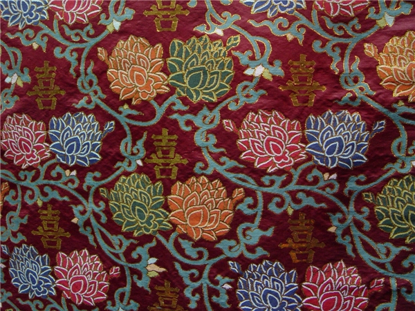 南京云锦作为皇室御用技艺与丝织品,在历来也用于皇室重大场合的服饰与装饰,在南京云锦博物藏品中,一件件带有祝贺之意的传世品,诉说着曾经在大喜之日的华丽表现。自明代传承下来的“喜字并蒂莲”云锦妆花缎面料,为当时的宫廷织物,原件出土于北京十三陵地下宫殿,是明万历皇帝的妃子婚用袍料。金色“喜”字表示喜气洋洋。莲花谐音“连结”、“相连”,而并蒂盛开的莲花则取意“在天愿作比翼鸟,在地愿为连理枝”的美好祝愿。