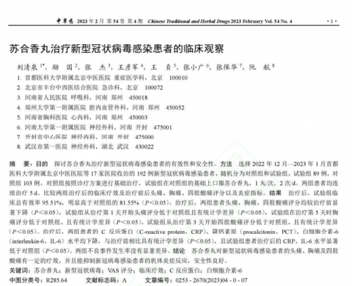 为进一步助力抗击新冠肺炎,雷允上集团与首都医科大学附属北京中医医院、北京市丰台中西医结合医院、 武汉市第一医院等17家医院联合开展一项关于“苏合香丸治疗新型冠状病毒感染患者的临床观察”的临床研究,以探讨苏合香丸治疗新型冠状病毒感染患者头痛、胸痛及四肢酸痛的安全性和有效性,为苏合香丸的临床应用提供证据支持。本次研究成果由首都医科大学附属北京中医医院院长刘清泉教授担任通讯作者,于2023年2月在 《中草药》期刊上进行发表。