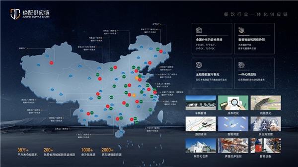 城际干线网络,拥有200条跨省跨城城际往返线路,1000+条冷链线路;区域城配网络通过城市分流点、分拨仓覆盖周围200-300公里的城市配送区域且具备日配日达能力;在采购、生产、运输、销售等供应链环节中,为餐企提供无缝对接式的冷链物流服务。