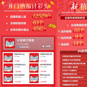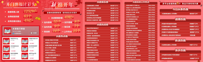这场活动展呈出的浓浓年味,不仅氤氲在城市的每一个角落,给大众留下一段难忘的新春记忆,也带来了持续不断的讨论热度。据统计,截至收官,抖音“新春万事屋”活动直播观看人数达1252万+,全网收割热榜63个,总曝光量超 45亿。其中,活动主话题#新春万事屋 在抖音站内有43亿+播放量;话题#群星过小年仪式感拉满 、#2023年第一条抖音 登上抖音热榜Top2,#明星祝你兔年大吉 、#明星和2022说拜拜 分别登上抖音热榜Top7、Top16,拉满了久违的春节氛围感。