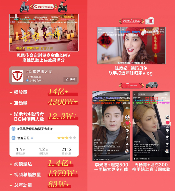 另外,抖音“新春万事屋”也为本次活动的总冠名品牌台铃与联合赞助商坦克、德玛贝尔进行个性化内容定制,多维度赋能品牌曝光与商业转化。活动联动总冠名品牌台铃为凤凰传奇定制的贺岁新曲MV《一起跑更远》,在站内首发后便收获大波好评。微博话题#凤凰传奇洗脑贺岁金曲#阅读量达1.4亿,微博视频播放量达370w+,并于快手、B站、小红书等多平台被广泛传播;与坦克伴随周扬青踏上回家路、重新再出发,视频中呈现出的温情、坚毅反差感获点赞不断,多平台发布互动量达8w+;同时还与坦克共同助力李光洁挑战雪场,一起探索生活的多种可能,发布互动量达9w+;联动德玛贝尔软膜为陈彦妃定制年味归家视频内容,一起见证生活的温情多面,温暖报春vlog获19.6w+互动量。这个新春,有欢愉、有温情、有力量。