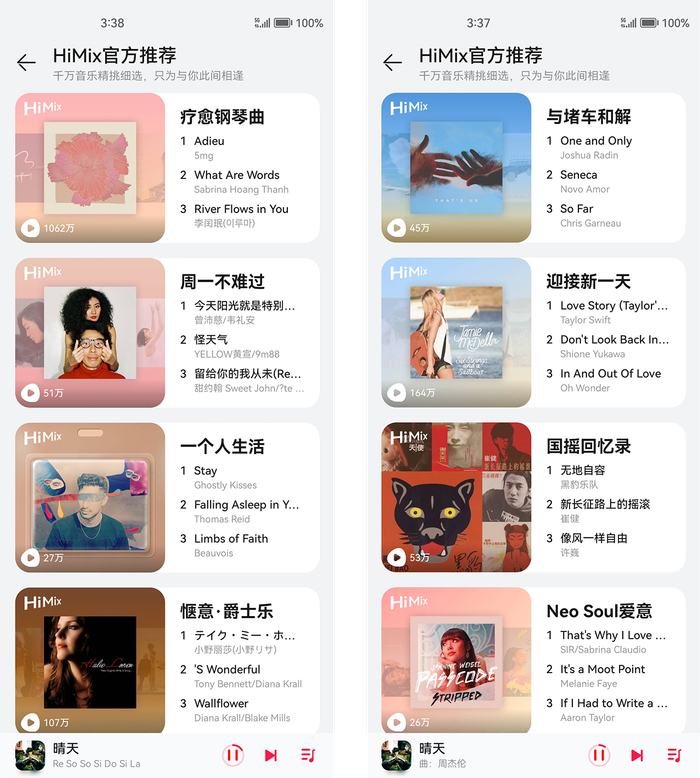 HiMix官方推荐歌单作为华为音乐精选栏目,由专业音乐编辑团队运营,主编牵头精选并动态更新不同风格与流派的曲目,完整覆盖长假、开车、学习、助眠等多个场景。在早晨的通勤路上,戴着华为FreeBuds 5i听一张《迎接新一天》,让自己在阳光照射下元气满满;夜深人静时,选一张助眠歌单《疗愈钢琴曲》,让静谧的琴声伴你入眠。