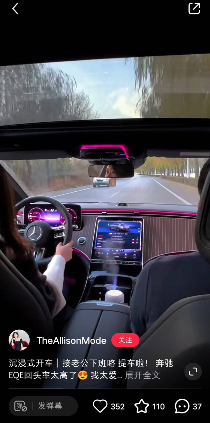 @TheAllisonMode分享了沉浸式开车接老公下班的vlog。开着心爱的奔驰EQE,副驾坐着老公,车上放着音乐,再配上EQE的氛围灯,谁能拒绝这样的幸福生活?