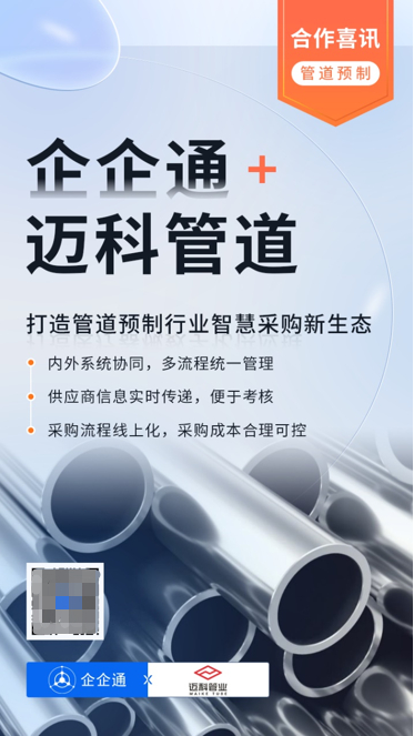 近日,国内管道预制龙头企业「济南迈科管道科技有限公司」签约企企通采购供应链系统二期项目。此次签约,将针对迈科管道的采购业务特点和需求,结合企企通采购与供应链管理系统优势和丰富的实战经验,在一期项目基础上,持续打造一个更加智慧化的采购新生态。