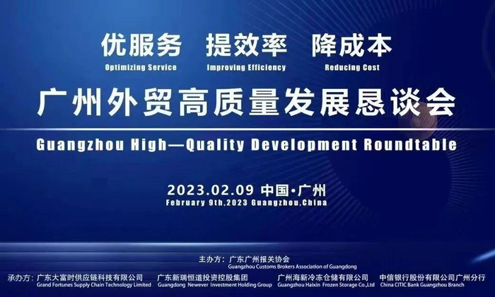 2023年2月9日由广东广州报关协会主办、广东新瑞恒道投资控股集团(下称新瑞恒道集团)等企业承办的 “优服务 提效率 降成本--广州外贸高质量发展恳谈会”在广州越秀国际会议中心举行。本次会议得到广州市政府的高度重视,广州市政府,广州市商务局、广州市空港经济区管委会、广州市市场监管局及各区政府等政府部门,海关总署广东分署、广州海关、黄埔海关、广州市税务局等9家中央驻穗单位;协会、商会、广州港集团、南航集团、省机场集团、外贸企业、航司、船司代表等150多人应邀出席了会议。新瑞恒道集团作为承办方,非常荣幸参与到此次会议,与各级政府部门、广大外贸企业交流沟通,围绕如何实现高质量发展,补足企业产业链、激活外贸源泉等议题展开深度探讨。
