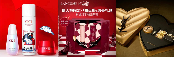 京东新百货数据显示,情人节期间,京东新百货美妆护肤品类中,成交额排名前五的品类分别是口红、面部精华、套装礼盒、香水、乳液面霜。在美妆护肤礼盒中,SK-II限定大白兔神仙水、兰蔻棋盘格口红礼盒、YSL限定香色礼盒最受消费者欢迎。