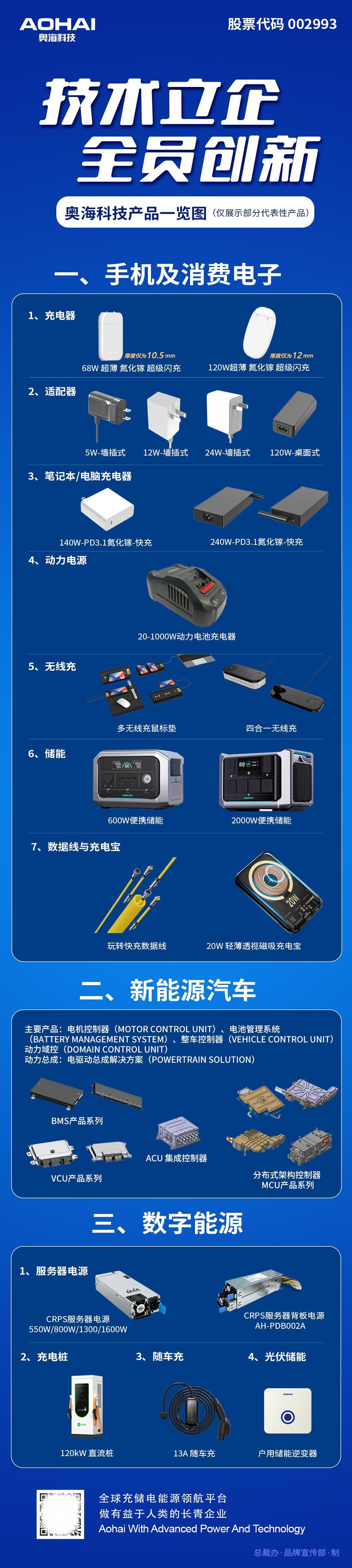奥海科技在十九年的发展历程中,在技术立企的发展战略指导下,产品已涉及手机及消费电子、新能源汽车、新能源光伏逆变等多个领域,打造了一个又一个市场爆品。手机及消费电子领域更是走在行业前端,引领了整个行业的发展。