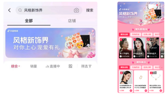 活动还将通过内容场景分发提升转化, 例如深度绑定商城搜索,建立潮饰品行业阵地,培养用户“潮饰品上抖音”购买心智,建立和强化“先锋潮流造型集合地”的C端影响力:用户通过商城搜索“风格新饰界”,即可进入风格赛道主会场;借助头部达人短视频引导、达人海报全域传播、话题活动、全媒体营销宣发等方式,培养用户左滑进入商城搜索习惯,并在38节、母亲节、520等大促营销节点连续加码推广,促进流量曝光。