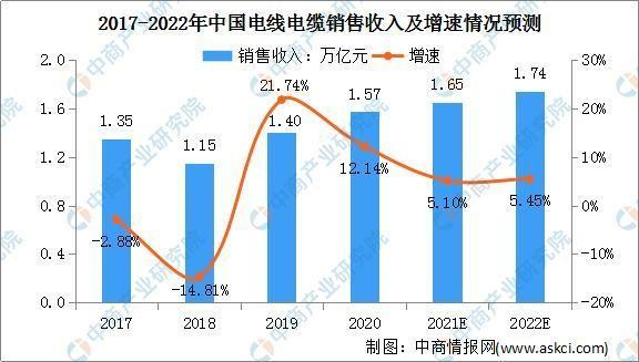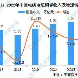 根据《2022年中国电线电缆行业市场现状及发展趋势预测分析》数据显示,2017年-2020年我国电线电缆销售收入总体呈波动增长态势,2020年中国电线电缆行业销售收入达到1.57万亿元,同比增长12.14%。预计2021年我国电线电缆销售收入将达1.65万亿元,同比增长5.10%,2022年我国电线电缆销售收入将进一步达1.74万亿元,同比增长5.45%。