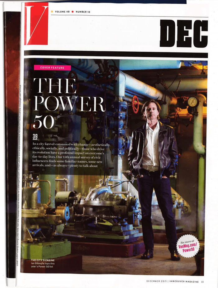 《温哥华杂志》是加拿大不可缺少的家庭手册,于1967年推出。50多年来,这个城市有影响力的人已经成为他们标志,并对温哥华的问题、人、地方和事件进行有见地的报道。从对重要问题的深入报道和分析,到专业的时尚、旅游、美食指南,《温哥华杂志》揭开了当代对人们形成深刻影响的内容。2015年的《温哥华杂志》50强榜单的第一名,就颁给了Westbank集团总裁伊恩。