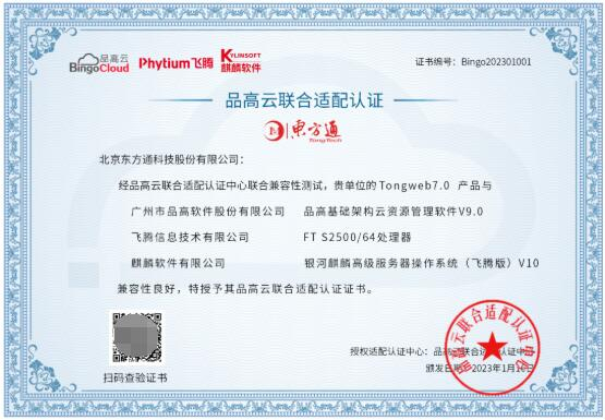 近期,北京东方通科技股份有限公司(简称:东方通)的Tongweb 7.0和北京星辰天合科技股份有限公司(简称:星辰天合)的天合翔宇分布式存储系统 V5,已经在品高云联合适配认证中心率先完成了由品高股份、飞腾公司、麒麟软件三方专业技术人员共同参与的联合适配与认证工作,并获得由三方联合颁发的产品兼容性认证证书。适配测试显示:各产品间兼容性良好,整体运行稳定。