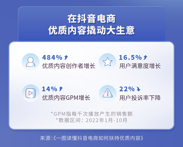 2月8日,抖音电商“寻找同行者”举办优质内容分享专场,邀请创作者代表和专家学者到场,分享平台发展优质内容的举措和成果,共同探讨电商内容生态的建设路径。数据显示,截至去年10月,抖音电商优质内容创作者数量较年初增长484%;平台挖掘优质短视频超147万条,助力超26万名创作者人均流量增长56%,GMV提升5%-10%。