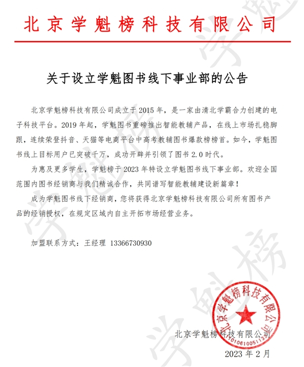 为惠及更多学生,学魁榜于2023年特设立学魁图书线下事业部。欢迎全国范围内图书经销商与我们精诚合作,共同谱写智能教辅建设新篇章!