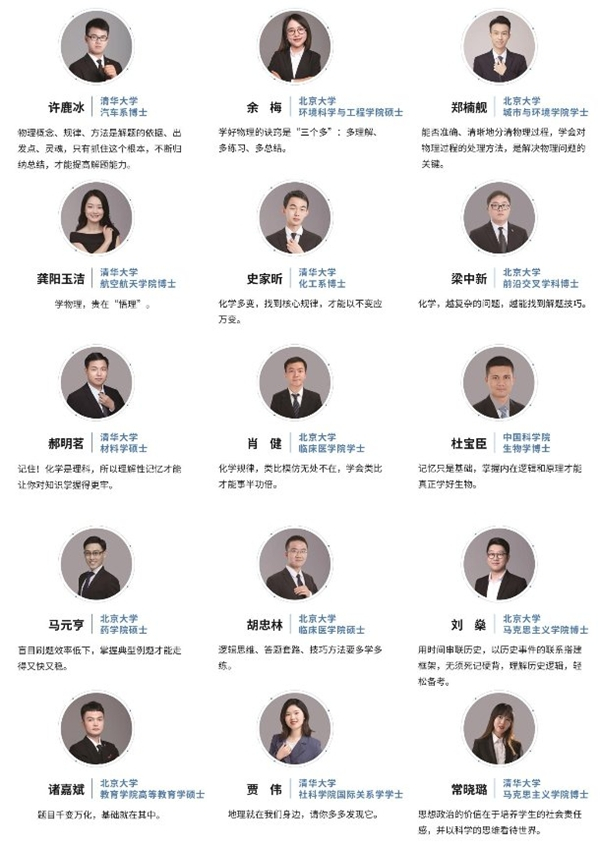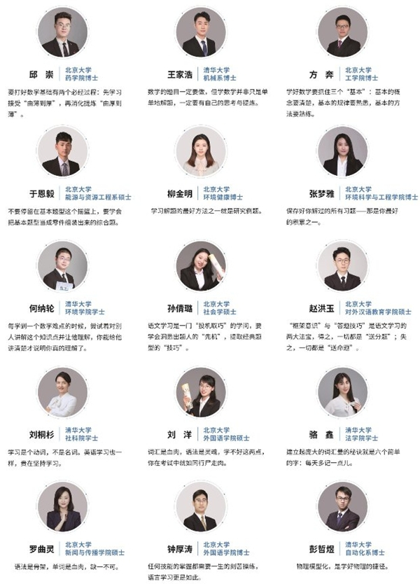 学魁榜由北京大学博士邱崇、清华大学博士史家昕领衔百位清北学霸、名师专家团、资深教研团三方合力打造。开创“学霸助学,一帮一带”理念,力求以学霸带出更多学霸。学魁榜资深教研老师包括: