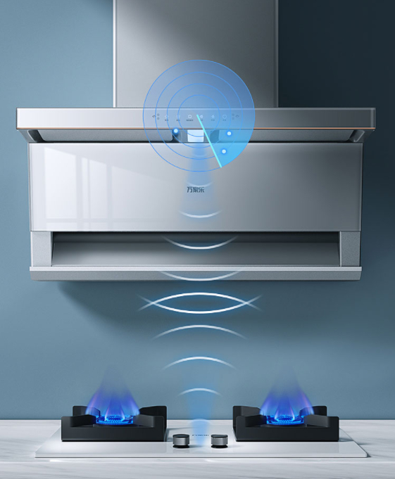 万家乐顶侧双吸油烟机W5还为智慧厨房的打造提供了挥手控烟功能。它配有红外线体感探头,能够检测手部动作,在烹饪过程中,无需触碰油烟机即可实现隔空开关控制,让油烟机面板时刻保持洁净,使用体验极佳。