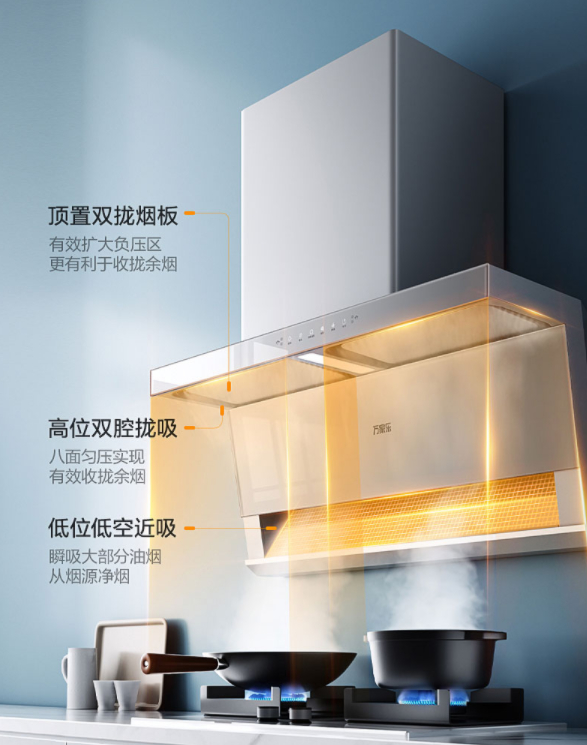 烹饪是一件神奇的事,油烟机给力,厨房便能香味扑鼻;油烟机不给力,那则是油烟扑面。解决厨房油烟问题,既有助于保障厨房卫生环境,又能大大提升烹饪过程的舒适度。万家乐顶侧双吸油烟机W5采用黄金三腔设计,独特的创新结构能够有效扩大负压区,高位双腔拢吸余烟,低位低空近吸,吸烟动力高达500Pa,吸烟风量高达23m3/min,能够吸走大部分油烟,净烟高效无遗漏,还原清爽厨房环境。