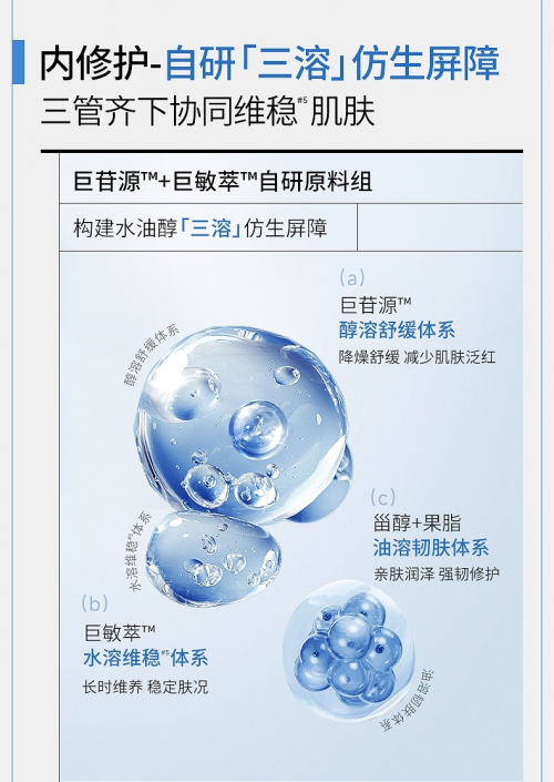 另一方面,可复美胶原乳的内修护仿生屏障体系,构建水油醇三溶仿生屏障,包含了自研原料组巨苷源™醇溶舒缓体系、巨敏萃™水溶维稳体系,以及甾醇+果脂油溶韧肤体系。巨苷源™舒缓体系含有肌肤“灭火器”之称的鲁斯可皂苷元和新鲁斯可皂苷元,配合舒缓“优等生”积雪草提取物和羟基积雪草甙,降燥舒缓,改善肌肤泛红。巨敏萃™维稳体系含有海茴香提取物、马齿苋提取物等8种植提,给肌肤带来长效稳定修护。