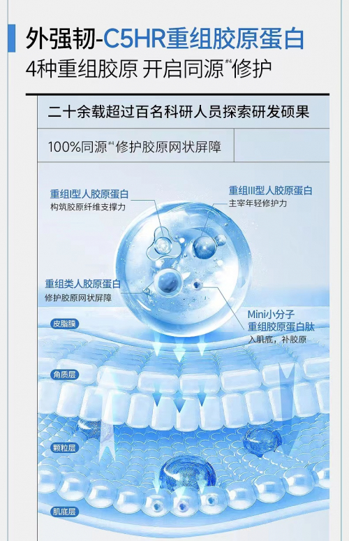 众所周知,胶原蛋白是人体中的一种重要蛋白质,对我们皮肤在创伤后的修护、肌肤屏障的强韧、以及皮肤紧致和弹性的维持,都起到了至关重要的作用。外强韧仿生屏障体系中的C5HR重组胶原蛋白仿生组合是巨子生物的核心专研成分,该仿生组合里包含了四种不同的与人体胶原蛋白氨基酸序列100%一致的重组胶原蛋白成分(数据来源:中国化工学会组织编写的《胶原蛋白材料》一书,书号:978-7-122-40915-7),其中包括核心专利成分重组胶原蛋白(中国发明专利,ZL201110327873.X)以及分子量只有217Da的Mini小分子重组胶原蛋白肽,可在肌底加持修护。