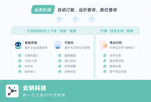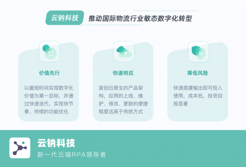 云钠科技正是在此大背景下诞生的企业,我们聚焦国际物流行业,与业内头部行业落地一系列创新实践,并将其标准化、产品化。期待用最低的成本、最快的部署周期,促进这个生态下包括中小微企业的数字化进程,助力其快速缩小数字化的差距,享受科技创新的价值????