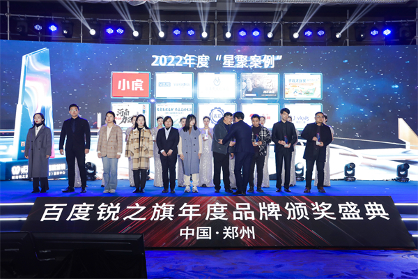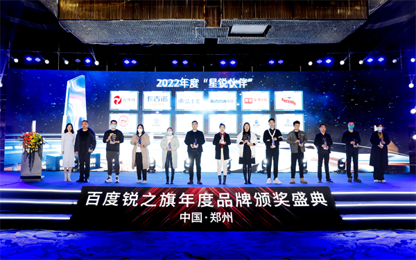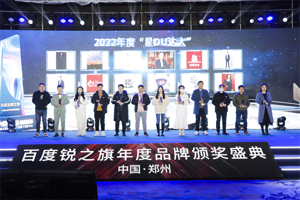 此次百度品牌之夜,百度营销联合锐之旗结合行业地位、营销数据、创意能力、智能化营销等角度综合评定,共评选出了2022年度“星AI品牌、星锐伙伴、星途伙伴、星聚案例、星DU达人”五大行业权威奖项。44余家中原品牌企业及12位自媒体优质内容创作者荣膺榜单,并现场颁发奖杯,以此鼓励品牌企业长远发展,鼓励自媒体达人创作出更多优质内容,树立标杆、凝聚品牌合力。