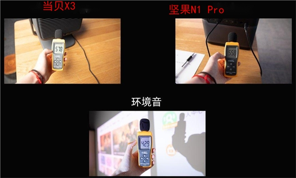 去除环境音后,坚果N1 Pro噪音为12.9dB;当贝X3噪音为14.9dB。两款机器噪音相差没有大悬殊,整体观影质量基本持平。