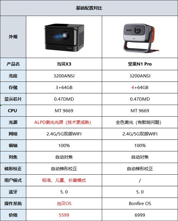 在性能配置上,当贝X3和坚果N1 Pro均采用MT9669芯片,该芯片常用于高端旗舰电视中使用,有所不同的是,坚果N1 Pro采用全色激光技术,当贝X3则采用ALPD激光技术,虽同为激光,但技术不同在画面表现上就有一定的差距。