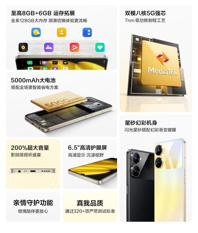 其他方面,真我V30搭载5000mAh大电池、八核双模5G强芯、6.52英寸高清护眼屏及1300万高清双摄,均为同价位段的越级配置。还支持亲情守护功能,可远距离守护家人,让子女更放心,长辈更安心。