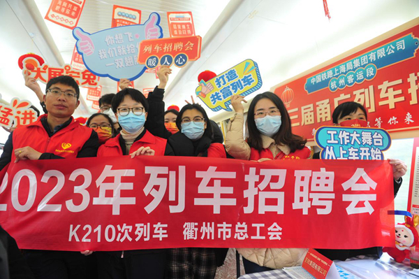 “坐着火车找工作,下了火车进厂门!”当天上午10时许,列车驶入浙江衢州站,乘务员在车厢里打起了快板、唱起了《早安·旅客》,欢声笑语间拉开了列车上的“抢人大战”。由衢州市总工会党组成员、副主席杨川丹带队,工会干部组成的工会志愿者小分队和3家企业的招聘人员带着28个工种、近500个岗位加入其中。