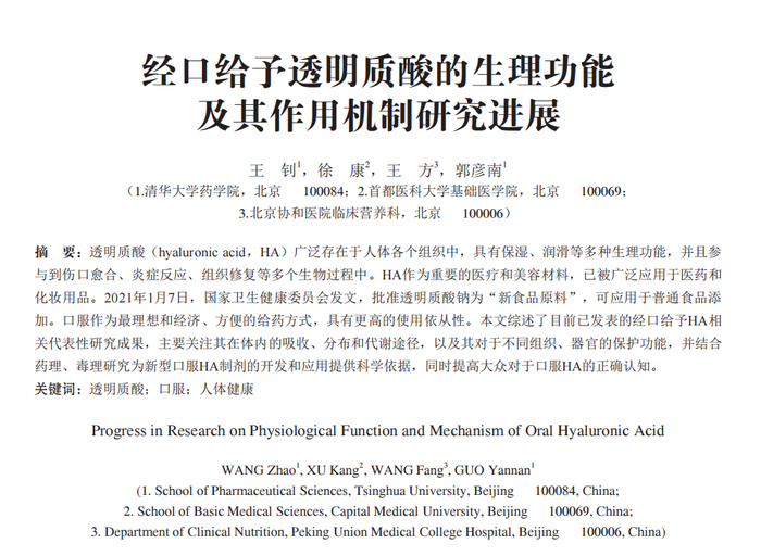 口服美容市场成分升级离不开学界对原料功效的深入研究。根据清华大学药学院,联合首都医科大学基础医学院及北京协和医院临床营养科,共同发表的《经口给予透明质酸的生理功能及其作用机制研究进展》中记载:“HA经口给予可以被肠道内的细菌降解为极低分子质量的HA寡糖(1~2 kDa),而后通过血液循环或淋巴循环迁移至皮肤。HA寡糖具有重要的生理学意义,LMW-HA和HMW-HA均可转移至皮肤,促进成纤维细胞增殖和HA再合成,最终实现改善皮肤状态、减缓皮肤衰老的功效。”