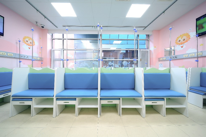 值得一提的是,在输液室中加厚坐垫的蓝色座椅,柔软舒适,隔板隔开的座椅,为患儿提供私人空间,部分座椅更是做了加长处理,方便婴儿平躺输液。座椅下设置矮凳,陪诊家长可在此休息。可调节高度的输液架,操作便捷,满足患儿不同部位的输液需求。多处插座的设置更是解决了家长们为手机充电的需求,细节之处见真情。此次设施及硬件打造以患儿和陪护人员的功能性和情感需求出发,更人性化,守护儿童健康成长。