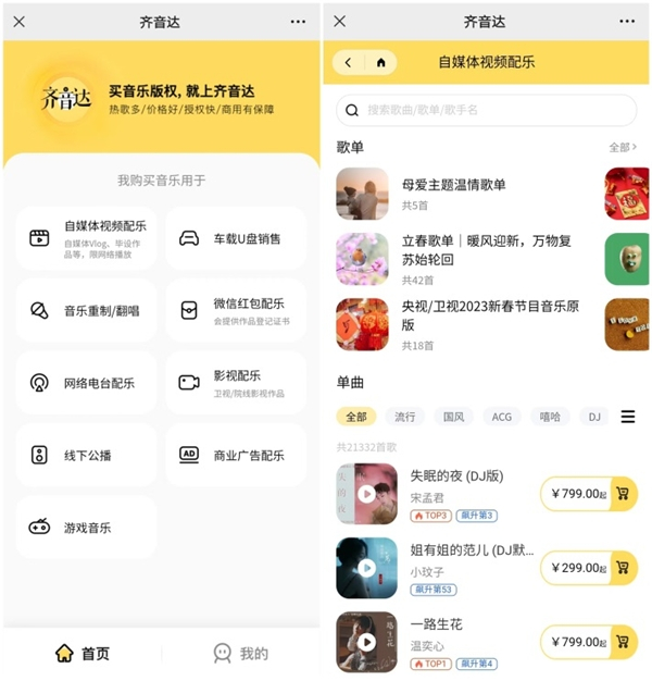 值得一提的是,齐音达便捷的版权购买流程,对自媒体人也十分友好。个人、媒体及品牌用户只需关注【齐音达版权音乐购买】微信公众账号,点击下方菜单栏的【购买版权】,即可进行选歌及版权购买。此外,平台商用音乐授权费用低至1元,且与众多知名厂牌、原创音乐人合作,歌曲商用有保障。