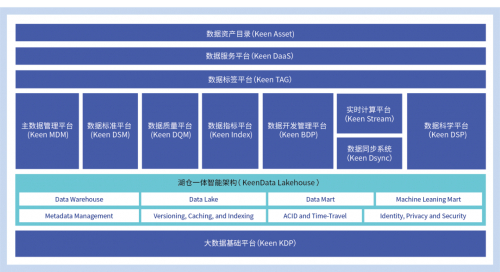 数据底座产品矩阵 KeenData Lakehouse,全产品矩阵设计在存储计算分离、湖仓一体领先技术架构基础之上,结构自下而上由大数据基础平台Keen KDP、数据同步系统Keen Dsync、数据开发管理平台Keen BDP、实时计算平台Keen Stream、数据科学平台Keen DSP、数据标准平台 Keen DSM、主数据管理平台Keen MDM、数据质量平台Keen DQM、数据指标平台Keen Index、数据服务平台Keen DaaS、数据标签平台Keen TAG、数据资产目录Keen Asset十二个产品构成。