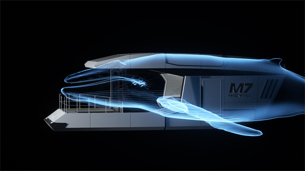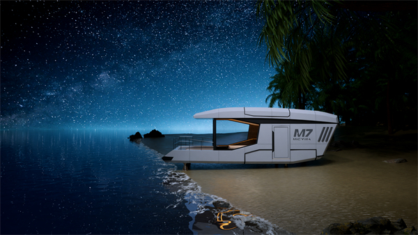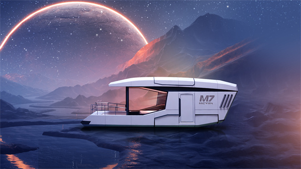 米墅太空舱M7整体造型设计灵感源自海陆空三栖梦,在水中它看似游艇,在陆地它看似汽车,在外太空它看似宇宙飞船,将超现实未来主义的想象呈现于太空舱M7。太空舱M7结构的横向构件按一定曲率切割排序,塑造整身流体曲面,模仿鲸鱼外形 。舒展而流畅的曲面、有序而富有张力的线条、简约而分明的棱角,高强度钢、铝合金、钢化玻璃的大胆碰撞,勾勒出极具科技感、未来感的流体立面,刚中带柔 ,探寻建筑的诗意与灵性。