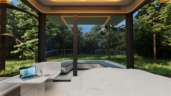 米墅太空舱M7采用大面落地式玻璃外墙+天窗+观景台,270度全景 ,让室内空间与周围环境融为一体,打造真正做到“睡进”大自然的治愈系度假空间。全屋整装国际知名品牌,奢享五星级度假品质。 半硬壳式结构结合特殊蒙皮工艺,整体稳定性极好,牢固安全,抗震等级高;外形符合流体力学,抗风能力大大增强;玻璃外墙采用LOW-E双层中空钢化玻璃,具有阻隔噪音、调节室内温度、降低辐射、增进采光的作用,也是目前世界上保温隔热及隔音降噪性能最理想的材料之一,墙体空腔内安装高效保温、隔音材料,整体保温隔热、隔音效果理想;防火、防潮性能高。看不见的匠心坚守,看得见的品质追求 ,只为创造更美好的生活。