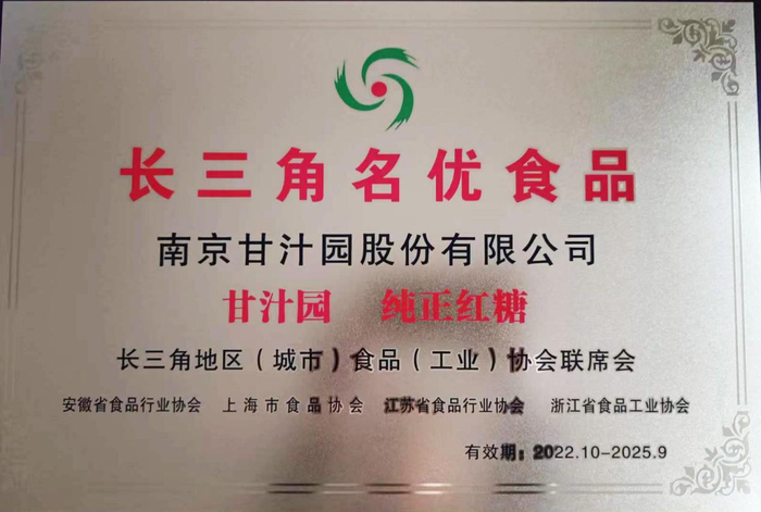 2023年2月17日,2022年度长三角名优食品品牌峰会在安徽宣城举行。长三角名优食品品牌峰会由江、浙、沪、皖三省一市食品工业协会共同举办。来自三省一市食品企业、行业协会的近300名代表参加峰会,共研长三角地区食品品牌建设。甘汁园股份有限公司纯正红糖荣获“长三角名优食品称号”。此前,甘汁园已经有姜汁红糖、双碳白糖、阿胶红糖、益母红糖等多款产品获得这一殊荣。