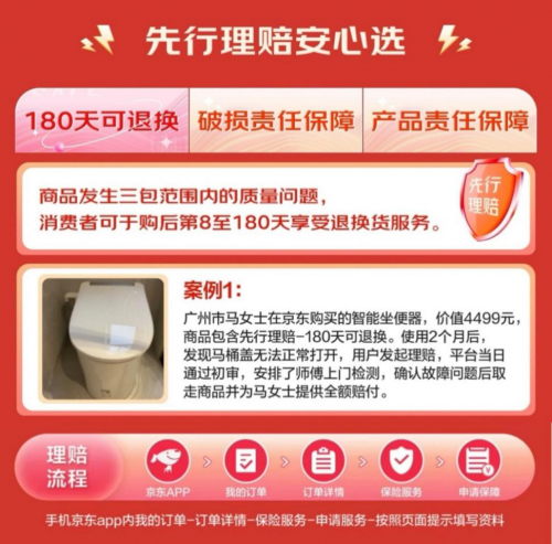 提前囤下的货品,等到开工、使用一段时间后才发现商品质量问题,但早已过了退换期,只能跟商家来回扯皮,很多消费者都遭遇过这样的闹心事。京东居家的先行理赔服务,打出180天业内最长退换期限,大幅延长保障周期。消费者购买支持该项服务的商品,如发生三包范围内的质量问题,可于购后第8天至180天内享受退换货服务。