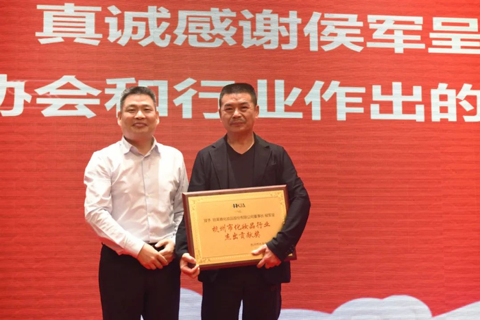 ▲大会对侯军呈同志在担任第三届会长期间组织领导协会工作,为杭州化妆品行业的无私奉献和辛勤付出,给予高度评价和充分肯定,特别授予侯军呈同志“行业杰出贡献奖”奖牌。杭州市社会组织管理局葛卫平局长为其授牌。